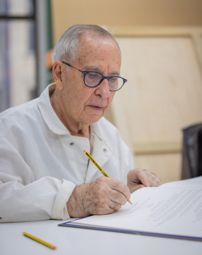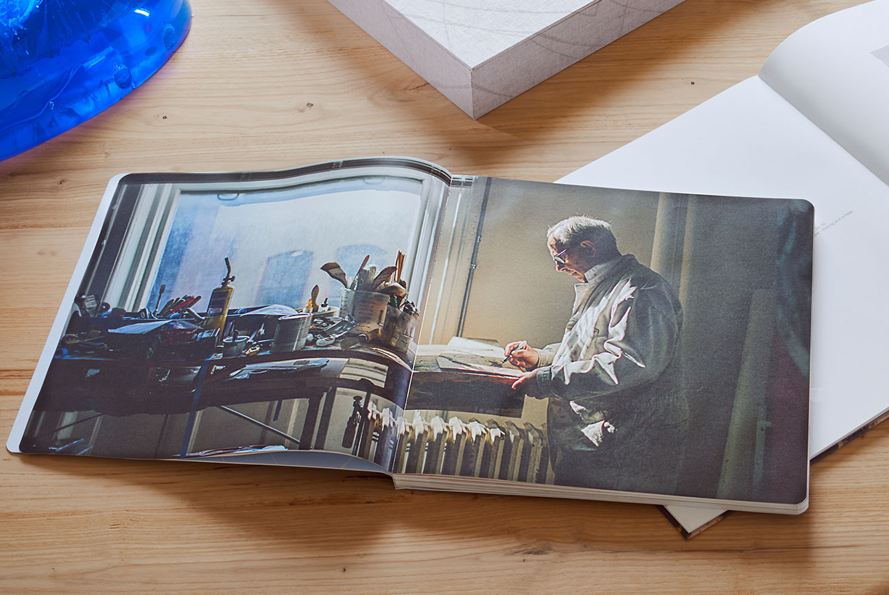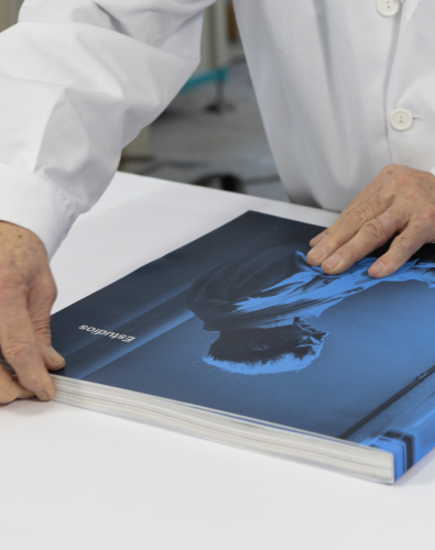 Los dos volúmenes han sido encuadernados artesanalmente, trasladando la esencia del artista en su taller, escena que se convierte en la portada del Libro de Estudios.