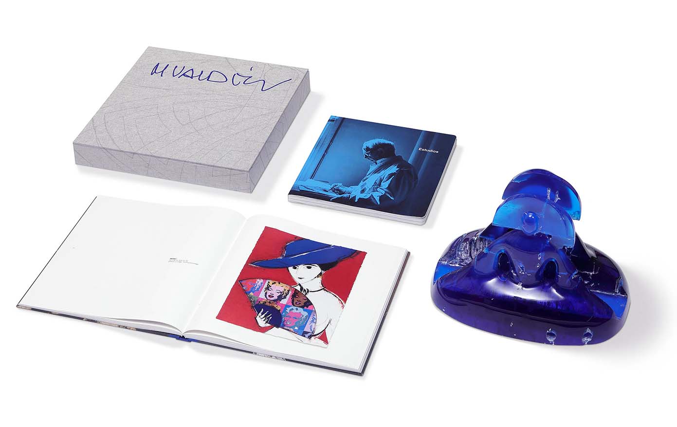 Un estuche de madera vestido en elegante tela gris estampada con la firma del artista contiene la obra protegida con un cierre de imanes.
