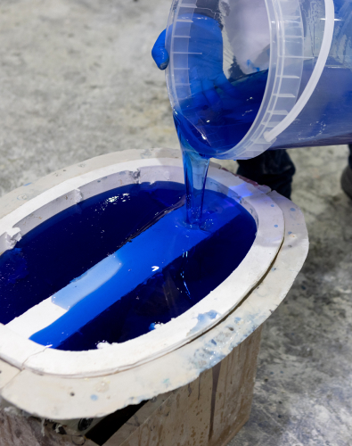 Con resina tixotrópica mezclada con tinte azul se llena el molde de silicona y se deja endurecer manteniendo esta composición en reposo.