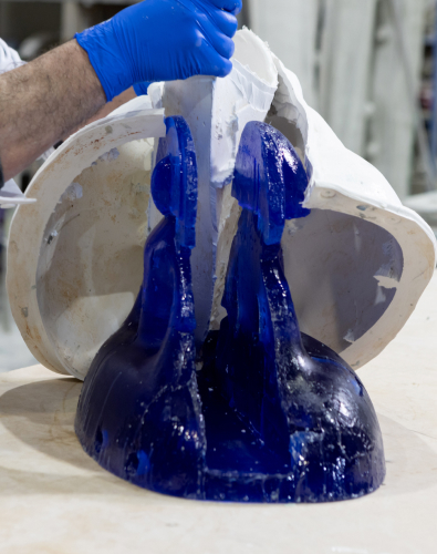 Una vez alcanza su estado sólido, se desmolda con cuidado y se descubre la vibrante y transparente menina azul.