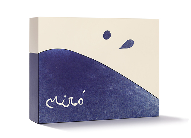 - Lacquered MDF case, two-piece format. Upper lid lacquered in cream with blue drops printed in inkjet using textured UV inks. Lower base lacquered in textured blue with a front gradient and Miró’s signature printed in inkjet with UV inks